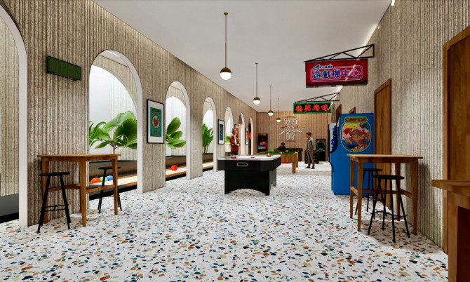 Lebhafte Tagungslounges befinden sich in der majestätischen Lobby mit vierfacher Höhe. Freiliegende Decken sind mit künstlerischer Beleuchtung bereichert. Terrazzo-Böden sind mit Messing-Dehnfugen getrennt und mit Designermöbeln dekoriert. Die Etagen des Restaurants sind mit bequemen übergroßen Sitztreppen verbunden. Co-Working-Etagen bieten flexible Arbeitsräume für diejenigen, die von zu Hause aus arbeiten. Der Unterhaltungsbereich umfasst; Kinosäle mit Kinositzen, Gaming-Hub mit virtuellen Sportsimulatoren und eine professionelle Bowlingbahn mit Parkettboden und strukturierten gewölbten Betonwänden.